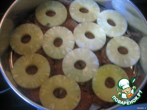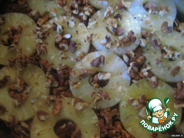 Готовым кремом закрываем ананасы и выкладываем сверху оставшимися половинками пряников.
