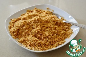 Печенье перемалываем в блендере. Добавляем растопленное масло. Перемешиваем.