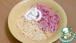 Трем на терке колбасу, сыр, чеснок, добавляем майонез.