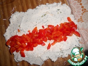 На пищевую пленку разложить творожную массу, посередине по долине выложить нарезанный сладкий перец. Свернуть в рулет. Завернуть в пищевую пленку и выложить в холодильник на пару часов.