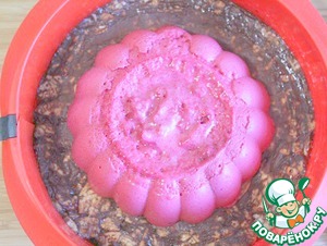 Достать форму и выложить мусс поверх, разровнять, постучать формой по столу и убрать в холодильник на ночь