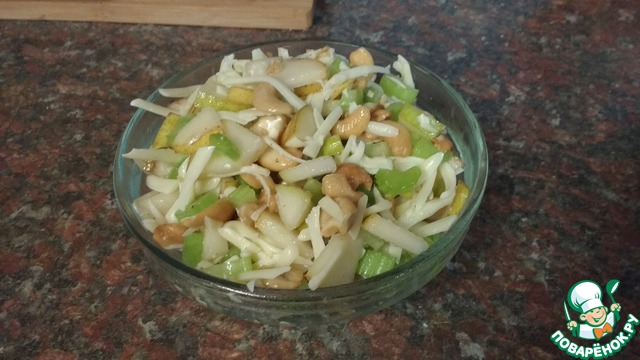Сельдерей, сыр и грушу смешать, добавить орехи. В этом салате можно использовать любые орехи, но тогда их следует крупно измельчить. Влить заправку и тщательно перемешать, поставить в холодильник минимум на 15 минут.