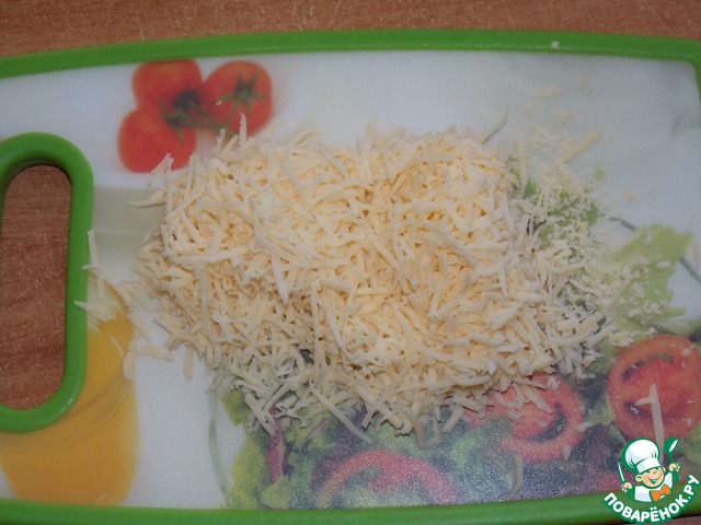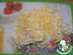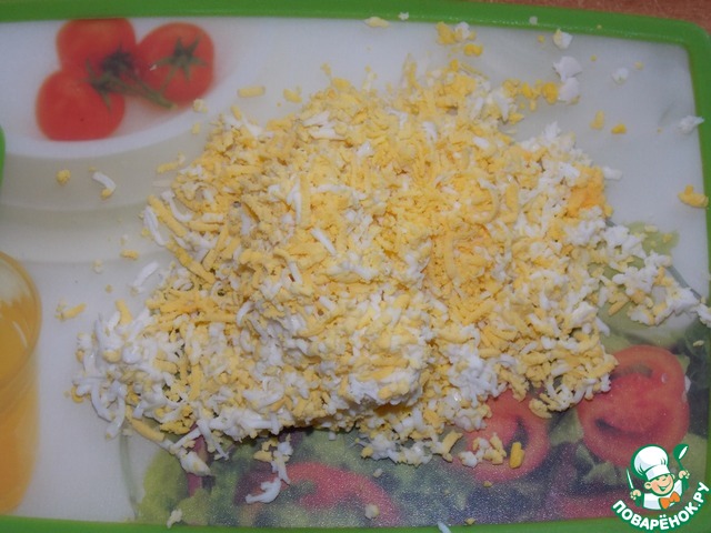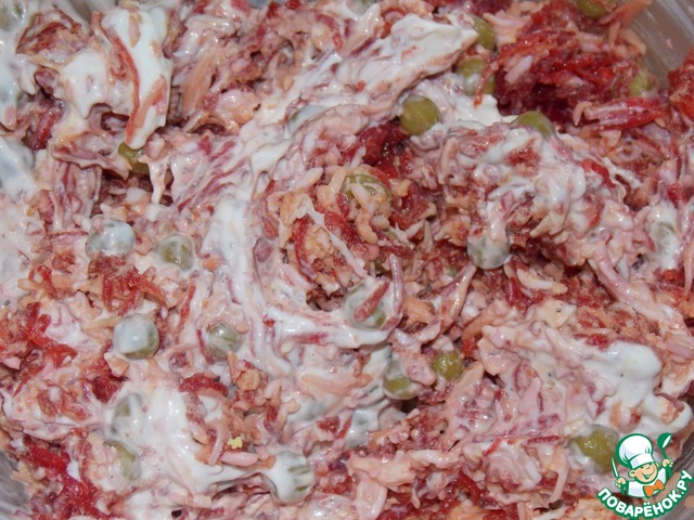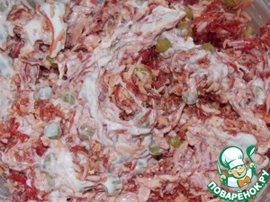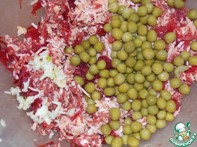 Добавить чеснок, пропущенный через чесночницу, горошек и майонез. -