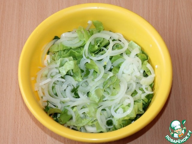 1. Приготовим салат. Лук нарезать полукольцами, залить кипятком, добавить уксус и сахар по вкусу, оставить на 10 минут. Затем воду слить и лук охладить.
