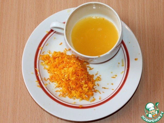 6. Приготовим соус и карамелизированные орешки. Выжмем сок (6 ст. л.) с одного апельсина и натрем цедру (1 ст. л.)