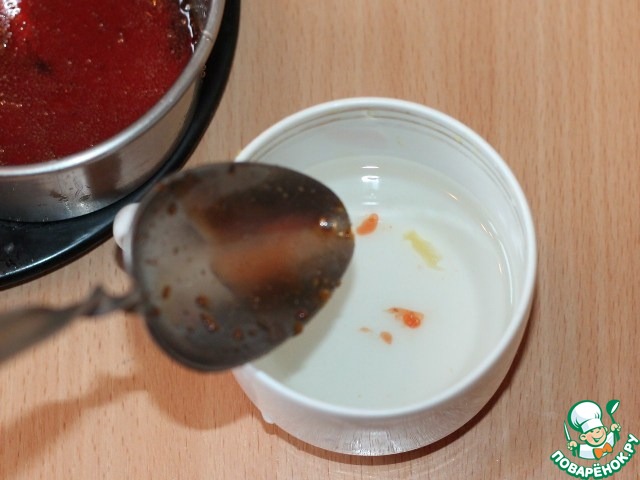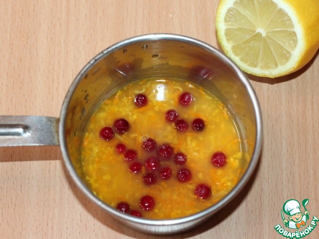 7. Поместим апельсиновую цедру, ягоду и сок в сотейник, проварим до мягкости ягоды. Протрем через сито и поставим смесь на тихий огонь.