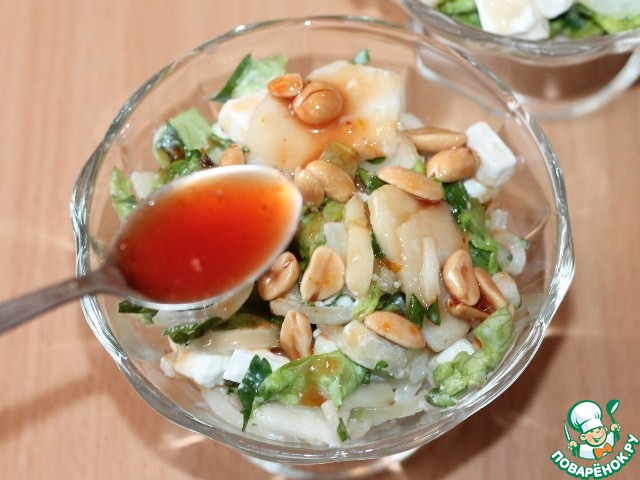 Вкусный салат с брынзой, грушей и карамельными орешками.