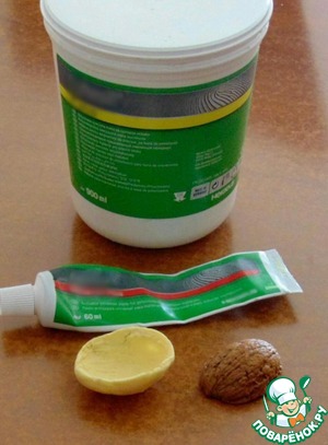 На коробке есть инструкция по замешиванию материала, нам остается нанести слепочную массу сначала на одну, затем на другую часть шкорлупы от ореха. У нас получится 2 силиконовые формочки. (я сделала сразу 10 шт) -