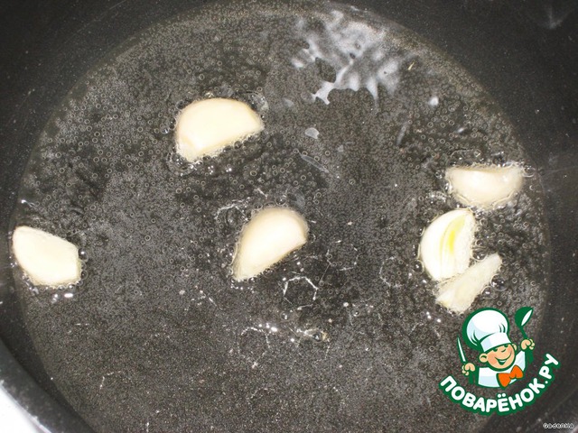 Сковороду разогреть с маслом, выложить чеснок и обжарить 2-3 минуты, затем чеснок убрать,