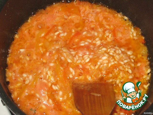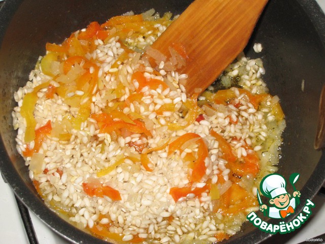 Затем влить 1 стакан воды, накрыть крышкой и тушить, пока жидкость не впитается, иногда рис помешивать.