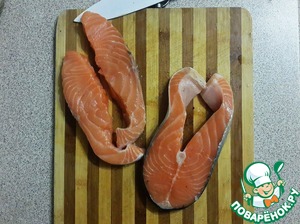 • Натираем стейки специями для рыбы, немного солим и сбрызгиваем лимоном. Берем форму, застелаем пергамент и кладем рыбу