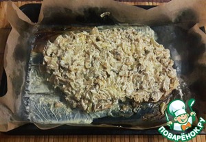 • Достаем рыбу, и слоем выкладываем нашу начинку