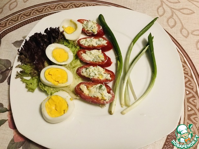 Из белков вырезаем чашечки для цветов, в серединку помещаем шарик сырной массы, тычинки и листья из зеленого лука.