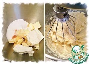 Мягое масло, сыр, сахар (3/4 стак.) и ванильный экстракт взбить в кремообразную массу.
