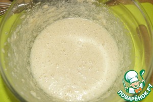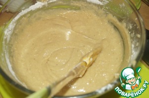 Добавляем пюре к яичной массе. Вливаем карамель и все перемешиваем. Муку смешиваем с разрыхлителем и небольшими порциями добавляем к массе, аккуратно перемешиваем до однородной консистенции