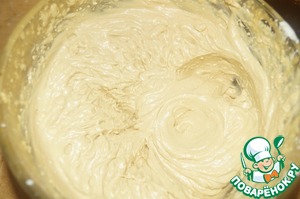 Приготовим крем. Сливки взбиваем до пиков, добавляем соленую карамель и творог, хорошо взбиваем. Убираем в холодильник.