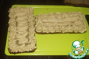 Готовому кексу дать полностью остыть, разрезать кекс на 3 коржа и прослоить кремом.
