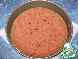 Бисквит я разрезала на три коржа, но в торт использовала два (один пошел на другой десерт). Конечно, можно использовать все коржи... В форму выложила первый корж.