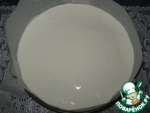 Бока формы закрыла пергаментом. Залила половиной творожной массы, постучала по столу, чтобы заполнить все пустоты