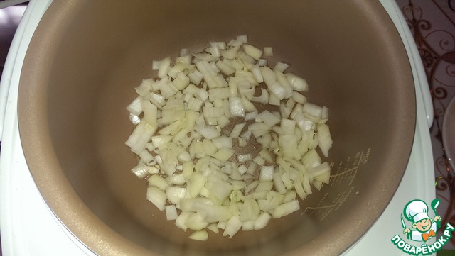 Включаем режим"Жарка". Обжариваем мелко порезанный лук на подсолнечном масле до прозрачности.