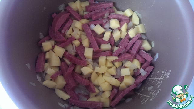 Добавляем колбасу нарезанную соломкой и обжариваем пару минут. В это время займемся картофелем