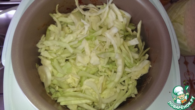 Закидываем нашинкованную капусту. Совет: если не влезает вся капуста, даем ей слегка притушиться и добавляем остальную. Готовим до ужарки капусты.