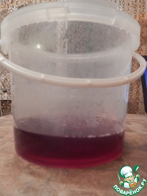 Перелить в круглую форму. Тут у меня произошел казус... сломался зажим на разьёмной форме и я заливала в пластиковое пищевое ведро одинакового диаметра. ( 22 см) Поставить желе на холод до полного застывания.