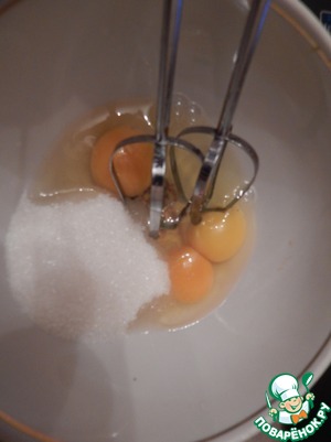 Начинаем заниматься бисквитом, для этого взбить яйца с сахаром до пышности (не разделяя на белки и желтки)
