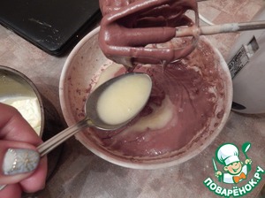 Отложить в отдельную миску 1/3 часть мусса и смешать с частью растворившегося желатина - эта часть будет покрывать корж. -