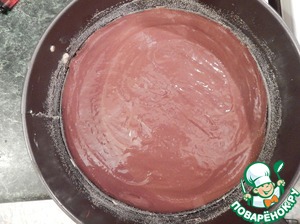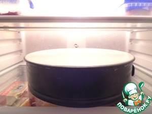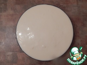 Выкладываеи бисквит в форму, в которой он выпекался, ставим кольцо от формы, защелкиваем его, затягивая форму. Сверху на пропитанный корж вылить ту часть мусса, что соединена с желатином. Поставить в холод до застывания мусса.
