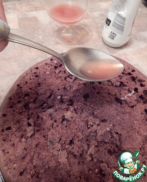 Начинаем собирать торт. Бисквит пропитываем смесью соуса, воды и коньяка
