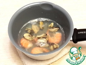 Креветки и мидии залейте водой, добавьте соль и варите 1 минуту, слейте воду и остудите.