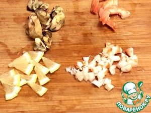 Креветки нарежьте на кусочки, оставив хвостики, оставшуюся половину лимона также нарежьте мелко.