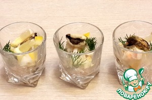 Разложите по рюмкам мидии, креветки и лимон, добавьте по веточке укропа.