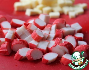 Крабовые палочки и сыр тоже нарезать кубиками.