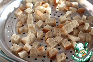 Батон нарезать кубиками, приправить солью и сушеным чесноком. Посушить в духовке.