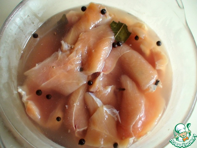 Куриное филе вымыть, обсушить салфетками и разрезать вдоль, не дорезая до конца, раскрыть как книжку. Положить в маринад, накрыть пищевой пленкой и поставить в холодильник на 24 часа. -