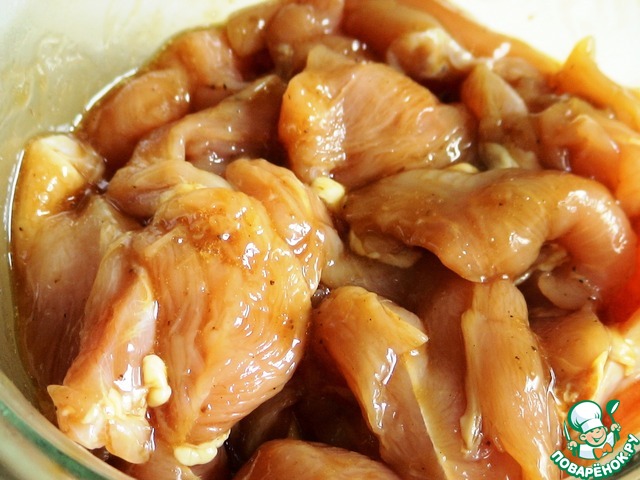 Нарезать филе на ленточки и нанизывать на шпажки, в форме гармошки. Противень выстелить фольгой, уложить шашлычки и запекать до готовности. Периодически поливать соусом. Лучше конечно запекать под грилем, на решетке.
