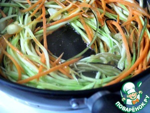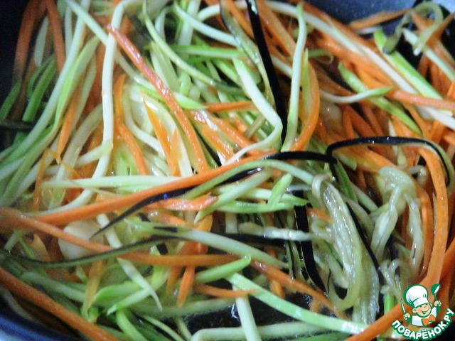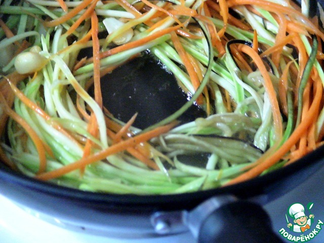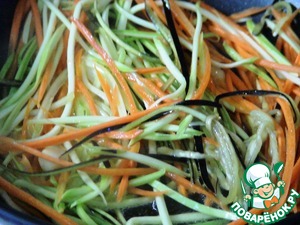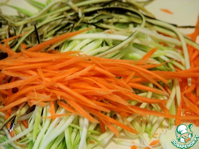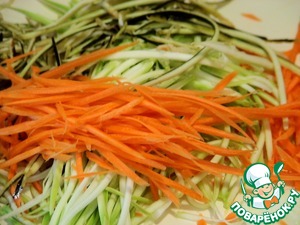 • Овощи вымыть, морковь очистить. На терке для корейской моркови нашинковать морковь. С баклажанов и кабачков нашинковать слой с кожицей и использовать только его.