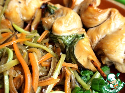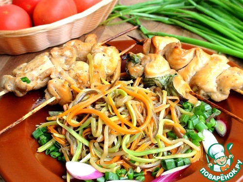 Рецепт «Шашлычки гармошки с овощными спагетти»: