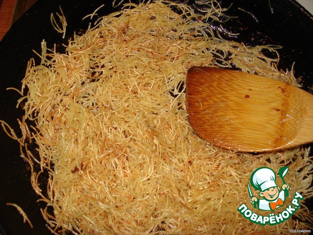 Вермишель обжарить в смеси масел до легкого покоричневения. Мелко порезать туда чищеные помидоры, выдавить пару долек чеснока, полить по вкусу соевым соусом и залить кипятком (немного). На маленьком огне, помешивая, дать впитаться воде.