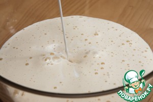 В яично-сахарную смесь добавляем йогурт и вливаем молоко, тщательно перемешиваем. (В оригинальном рецепте было только молоко, но, на мой взгляд, присутствие в тесте кисломолочного продукта делает оладушки более нежными)