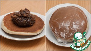 На середину одного блинчика кладем анко, накрываем вторым, заворачиваем наш бутерброд в пищевую пленку и хорошо прижимаем края, стараясь как бы склеить их между собой.