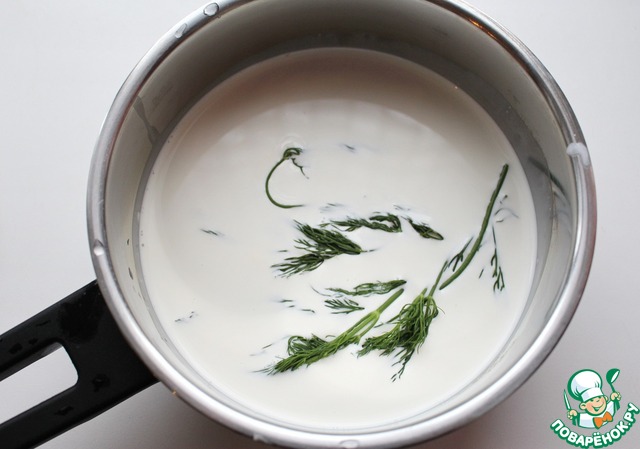 • 25 г укропа промыть, залить сливками и посолить. Поставить на огонь и нагреть, не доводя до кипения. Снять с огня, накрыть крышкой и дать постоять 3-5 минут.