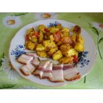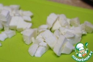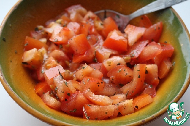 • Помидоры нарезать небольшими кубиками, приправить солью, перцем, сушеной мятой и растительным маслом (1 ст. л.), перемешать.