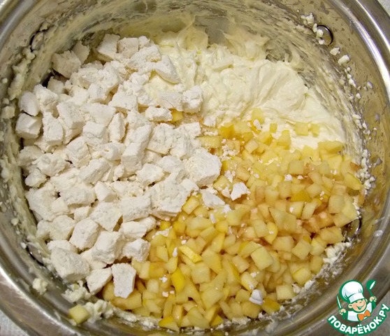 • Айву и зефир мелко порезать и хорошенько перемешать с творожной массой. Зефир можно брать как простой так и в шоколаде.