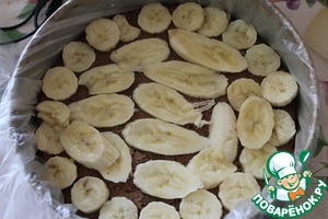 Я собирала тортик в разъемной форме застеленной пакетом (так проще). Кладём на дно формы наш корж, поливаем его сиропом (немного, чтобы не был сильно мокрым), выкладываем нарезанный кружками бананы.