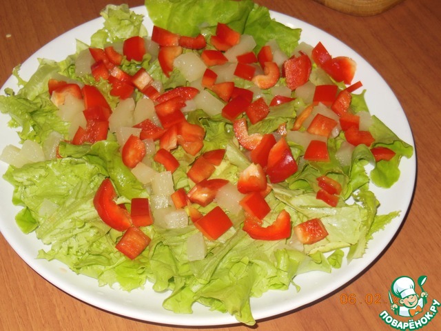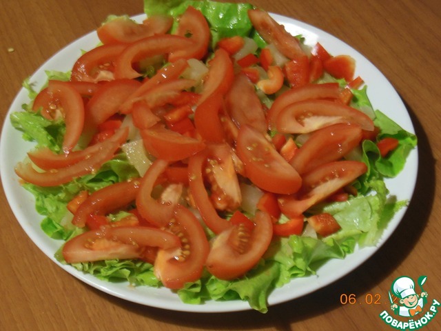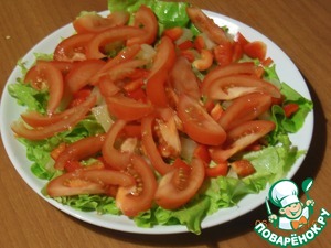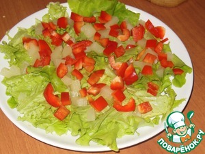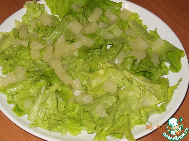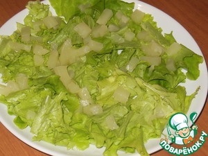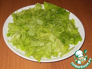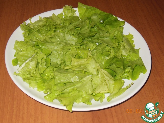 • На плоскую тарелку набросайте порванный на кусочки листовой салат