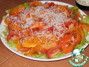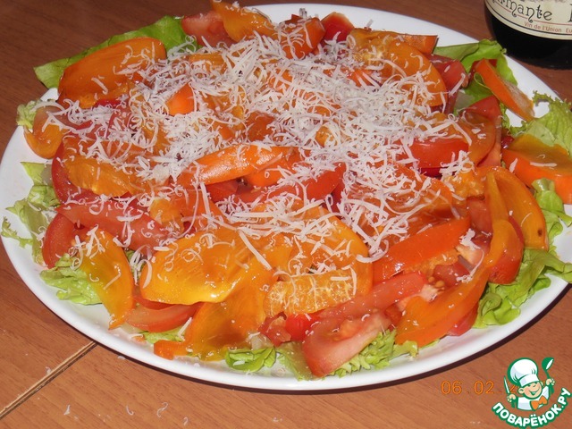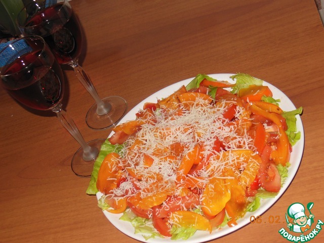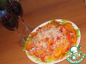 • Сверху посыпаем пармезаном. Собственно, всё. Мы пошли в разнос. Вино и отбивная пошли замечательно в кампанию к салатику.