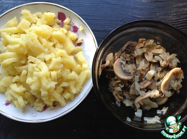 Картошку отварить в мундире, очистить и нарезать маленькими кубиками. Лук нашинковать и обжарить с грибами в небольшом количестве растительного масла.